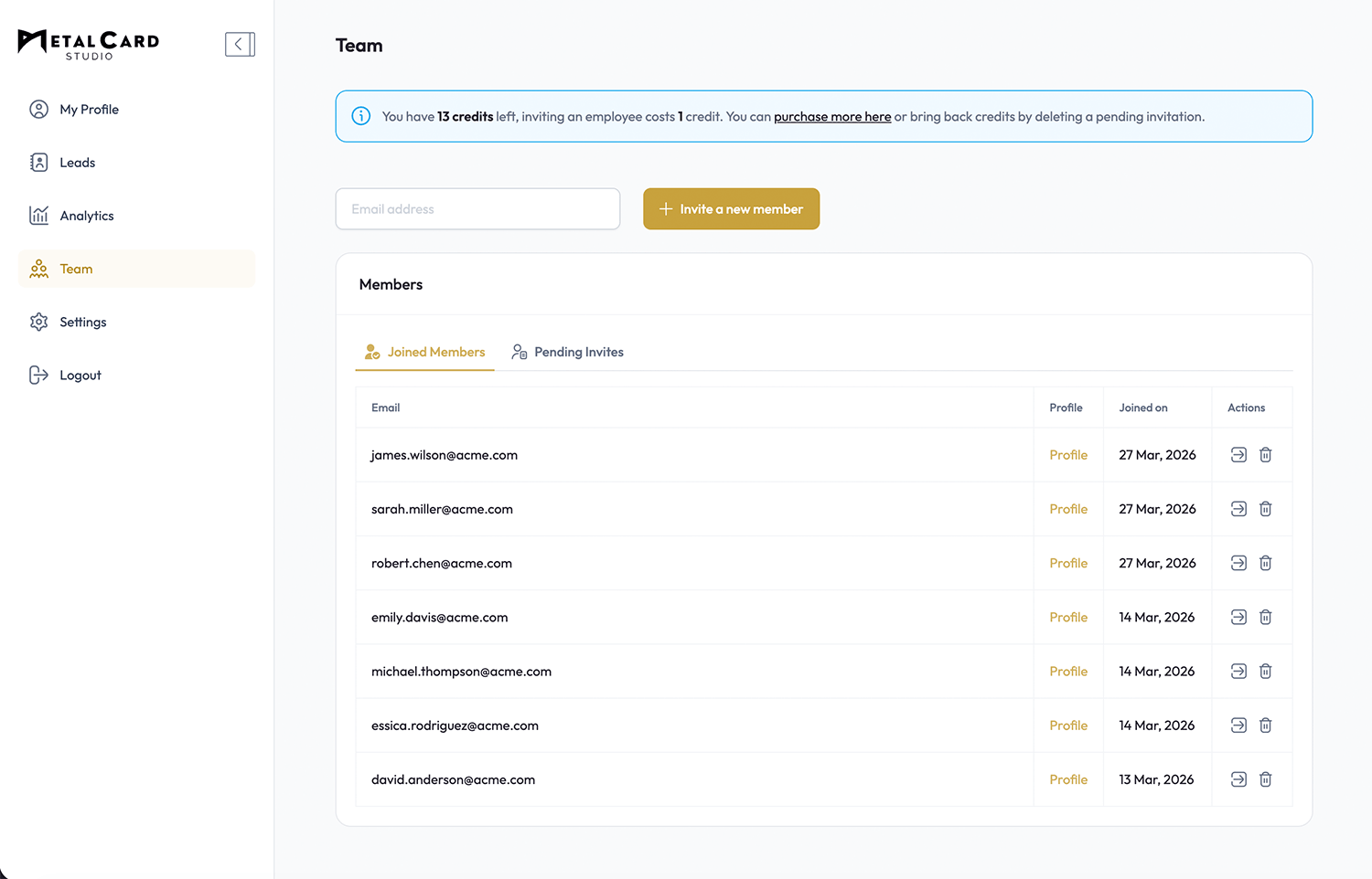 This enterprise-ready approach ensures brand consistency across your entire staff while making it simple to onboard new hires with their own premium NFC business cards in seconds.